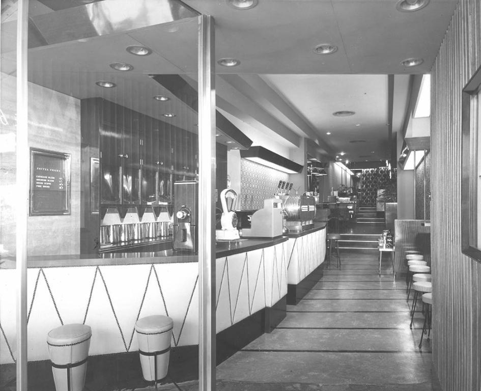 In keeping with the then trend to open up a complete interior view from the street the entrance was glassed and the door, when opened, became an unidentifiable part of the right hand wall.