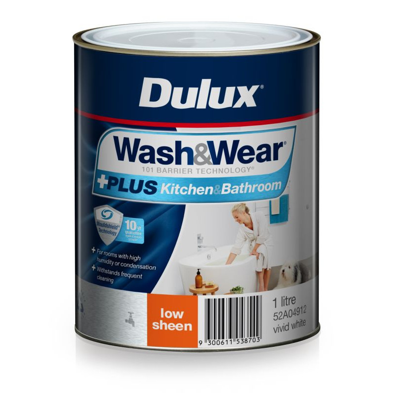 Dulux Wash & Wear Kitchen and Bathroom: $48.90, 1L.,Low sheen. Hard wearing. 10 year guarantee against mould growth. White base.