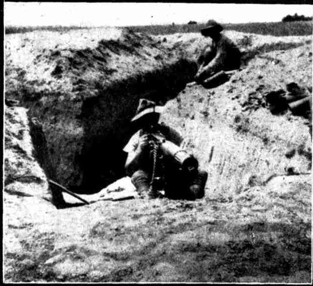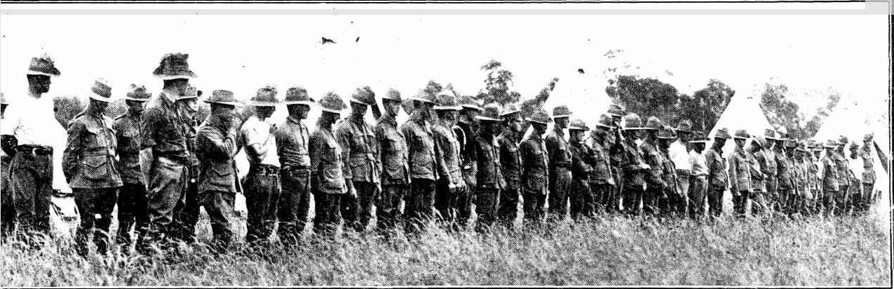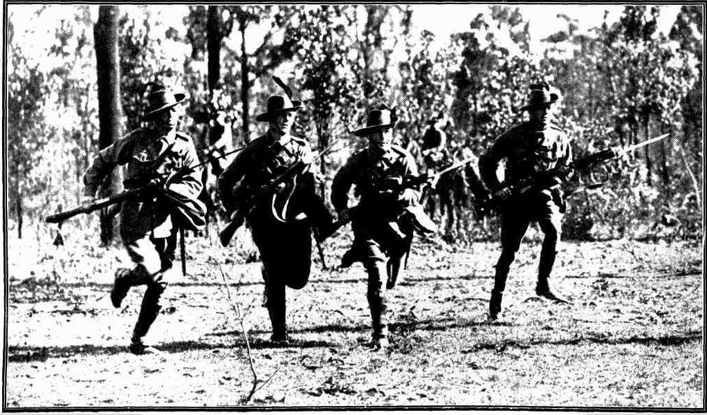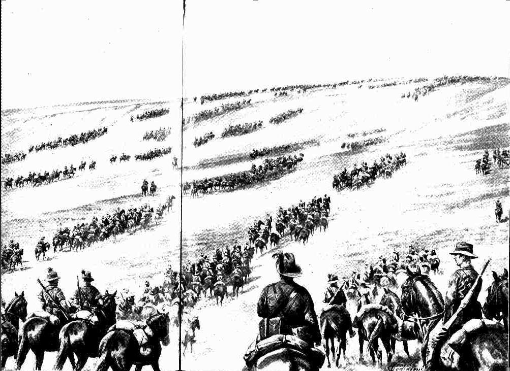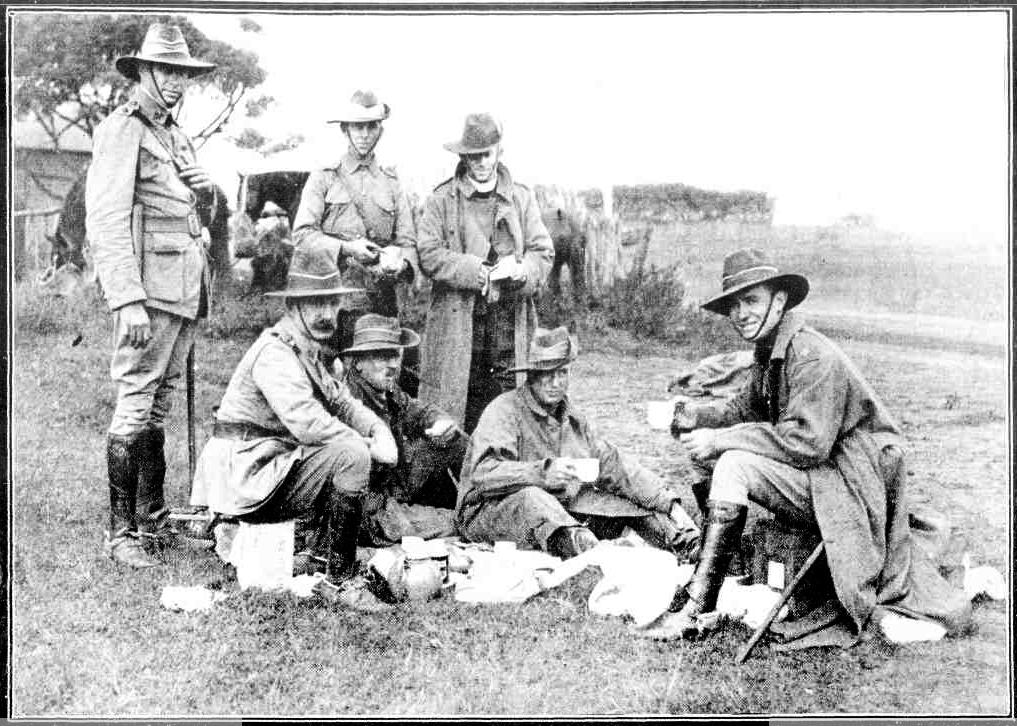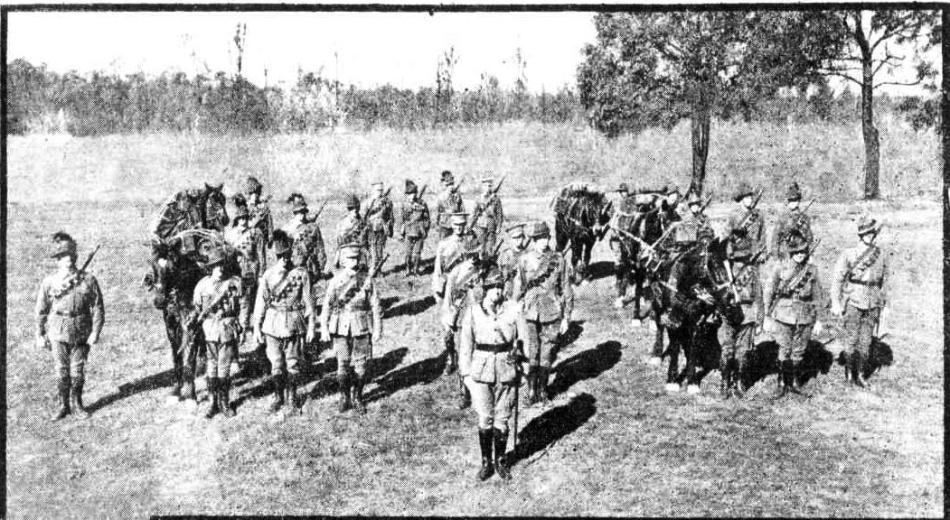 The 6th Light Horse Regiment, under the command of Lieut. Colonel Cox, C.B., V.D., and the 7th Regiment, under the command of Lieut.Colonel Arnott, are now encamped at Holdsworthy, about four miles from Liverpool. These regiments belong to Colonel Ryrie's Light Horse Brigade, and are composed of men of the very best type, all of them being well set up young fellows in perfect condition, who can both ride and shoot well. Colonel Cox is popularly known as 'Fighting Charlie,' because in the South African War he was always eager for the fray, and led his men confidently and well.