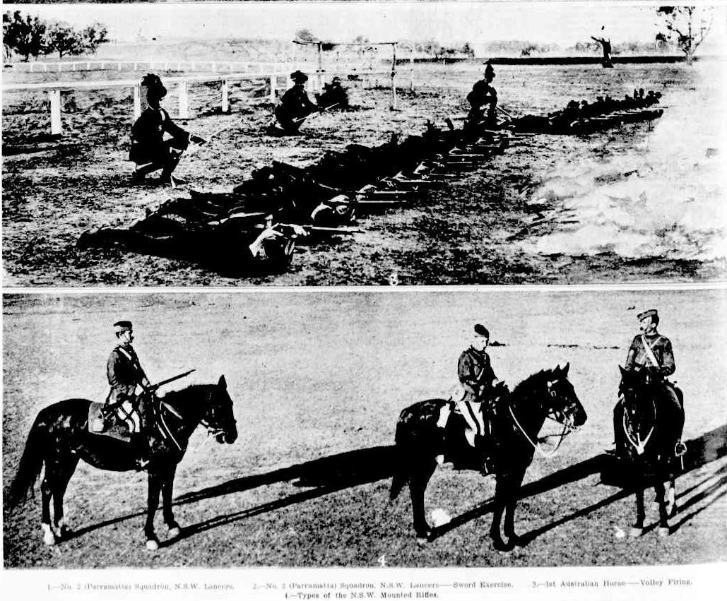 1. No. 2 (Parramatta) Squadron, N.S.W. Lancers. 2. No. 2 (Parramatta) Squadron, N.S.W. Lancers - Sword Exercise. 3. 1st Australian Horse - Volley Firing. 4.-Types of the N.S.W. Mounted Rifles.