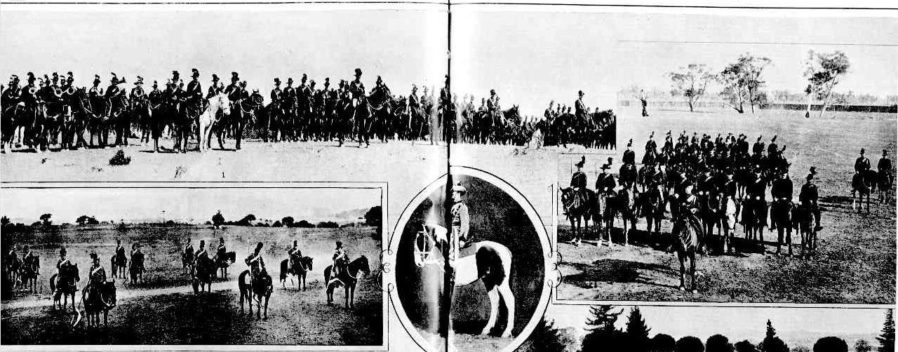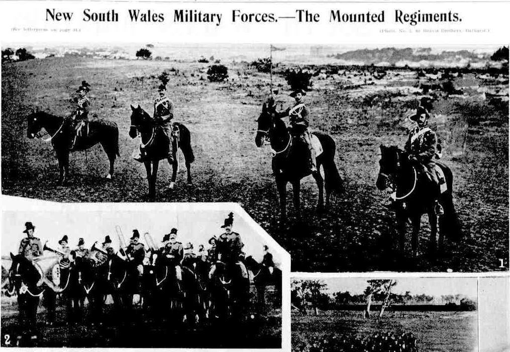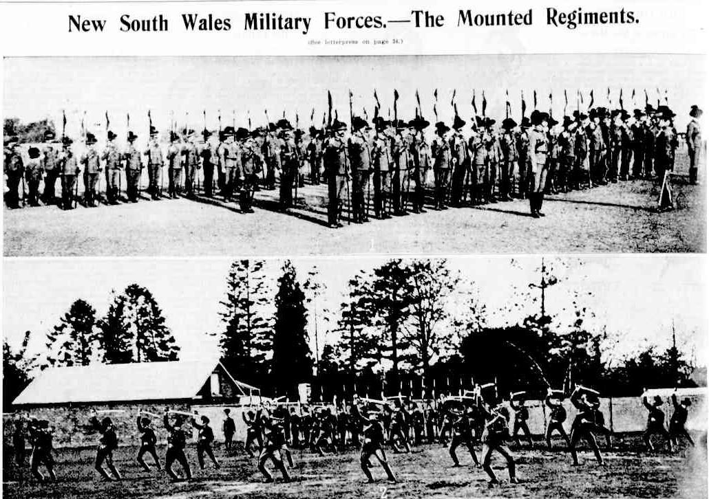 The regiment was originally composed of four squadrons of 100 each, by the strength and distribution of the regiment present is at follows: No. 1 (Sydney) Squadron No. 2 (Parramatta) Squadron; No. 3 (West Garden-Berry) Squadron, composed of half-squadron at West Camden and Berry; No. 4 (Martian Singleton) Squadron, composed of half-squadron at Maitland and Singleton; No. 5 (Casino-Lismore) Squadron, composed of half-squadrons ; Casino and Lismore; No. 6 (Richmond1-Windijo Squadron, composed of half-squadrons at Richmond and Windsor; and1 the Newcastle Half Squadron. There is mil soi a cadet half-squadron at Parramatta. Among the illustrations is pictures of the Sydney Squadron (which is commanded by Captain F. H. King) in review work While other pictures show the Parramatta Squadron (Commanded by Captain R. C. Mackenzie) column of half-squadrons, and at sword exercise and a portion of the Sydney Squadron at lance exercise. The pictures of the Parramatta Squadron show the drill order uniform of the regiment. In the picture of "types of the regiment" are shown an officer (Captain F. H. King a non-commissioned' officer, a trooper, and trumpeter. A picture of the splendid regimental band is also given, as well as an illustration of the drawn horse.