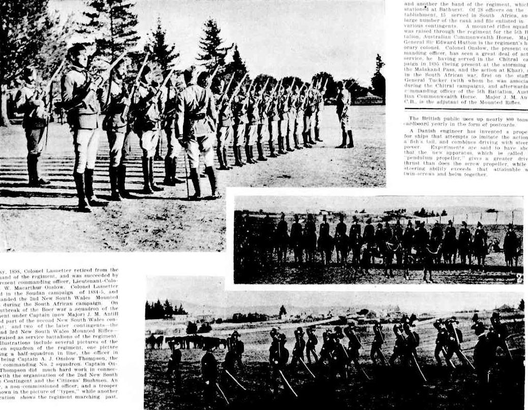 In May, 1898, Colonel Lassetter retired from the command of the regiment, and was succeeded by the present commanding officer, Lieutenant-Colonel J. W. Macarthur Onslow. Colonel Lassetter served in the Soudan campaign of 1884-5, and commanded the 2nd New South Wales Mounted Rifles during the South African campaign. On the outbreak of the Boer war a-squadron of the regiment under Captain (now Major) J. M. Antill formed part of the second New South Wales contingent; and two of the later contingents-the 2nd and 3rd New South Wales Mounted Rifles were raised as service battalions of the regiment. The illustrations include several pictures of the Camden squadron of the regiment, one picture showing a half-squadron in line, the officer in front being Captain A. J. Onslow Thompson, the officer commanding No. 2 squadron. Captain Onslow-Thompson did much hard work in connection with the organisation of the 2nd New South Wales Contingent and the Citizens' Bushmen. An officer, a non-commissioned officer, and a trooper are shown in the picture of "types," while another illustration shows the regiment marching past, and another the band of the regiment which is stationed at Bathurst. Of 28 officers on the establishment, 15 served in South Africa, and a large number of the rank and file enlisted in the various contingents. A mounted rifles squadron was raised through the regiment for the 5th Battalion, Australian Commonwealth Horse. Major General Sir Edward Hutton is the regiment's honorary colonel. Colonel Onslow, the present commanding officer, has seen a great deal of active service, he having served in the Chitral campaign in 1895 (being present at the storming of the Malakand Pass, and the action at Khar), and In the South African war, first on the staff of General Tucker (with whom he was associated during the Chitral campaign), and afterwards as commanding officer of the 5th Battalion, Australian Commonwealth Horse. Major J, M. Antill, C.B., is the adjutant of the Mounted Rifles.