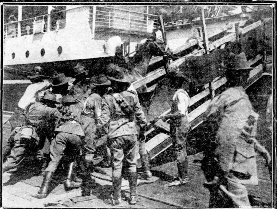 SCENE AT THE EMBARKATION OF THELIGHT HORSE, GIVING AN IDEA OF THE DIFFICULTIES OF THE WORK. TRANSPORTING AUSTRALIAN LIGHT HORSE (1915, June 13). Sunday Times (Perth, WA : 1902 - 1954), p. 6. Retrieved from http://nla.gov.au/nla.news-article57800493