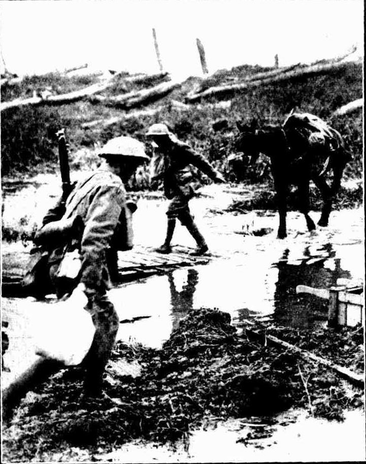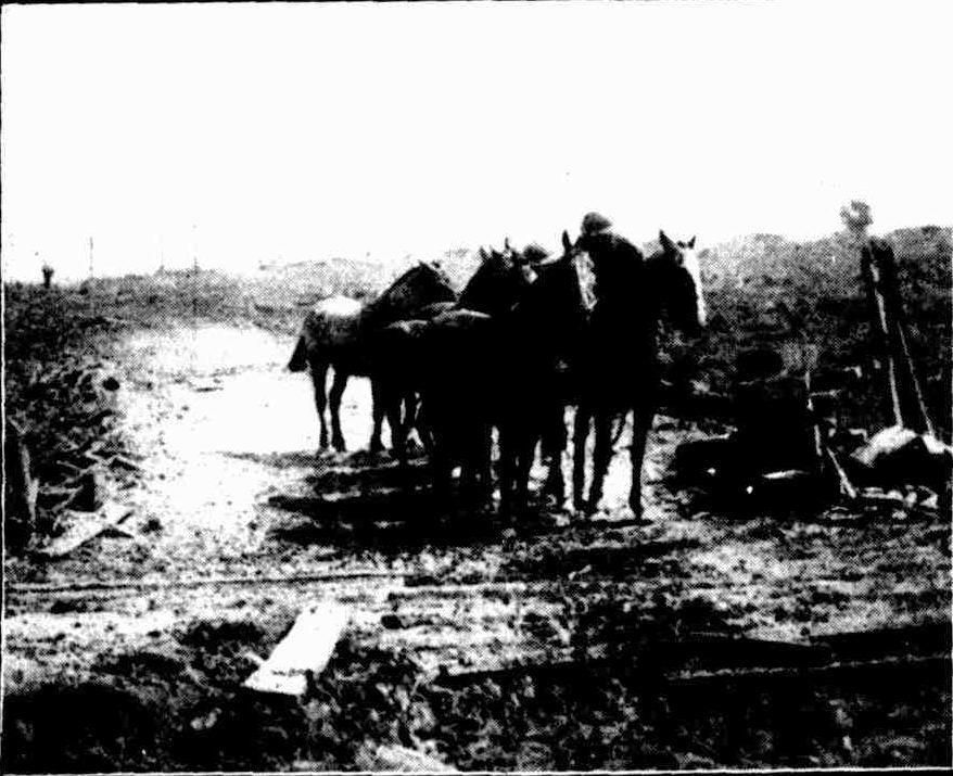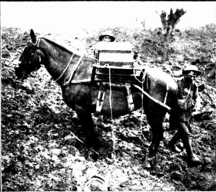 The three photographs reproduced above were taken on the Western front, where enormous numbers of horses are in constant use in connection with various war activities.