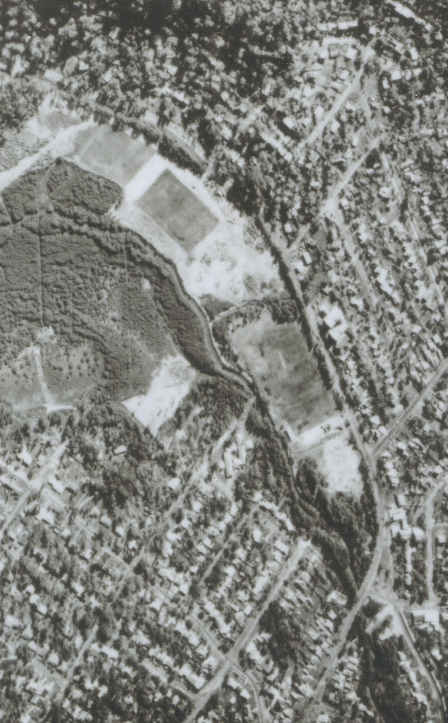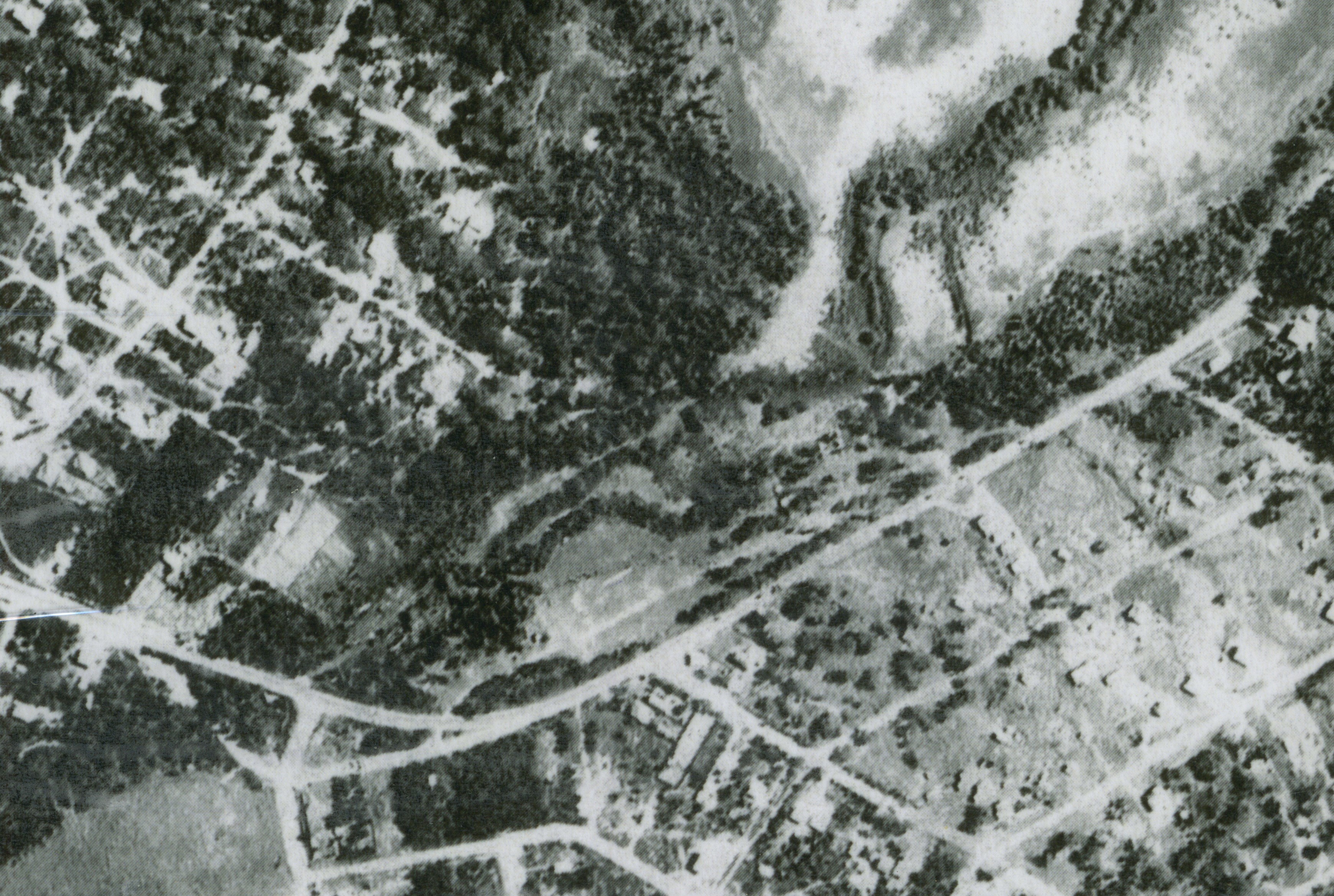 In the early days of settlement the Collins family had a dairy farm at Careel Bay. It occupied most of North Avalon. They leased the land from Father Therry. The creek was dammed just south of the present North Avalon Rd to ensure a supply of freshwater. It had an earth wall, with a spillway on the western side. Below the dam Barrenjoey Rd crossed the creek. A 1930 aerial photo indicates the dam was well and truly gone but had left a strange “kink” in the creek. [2.]