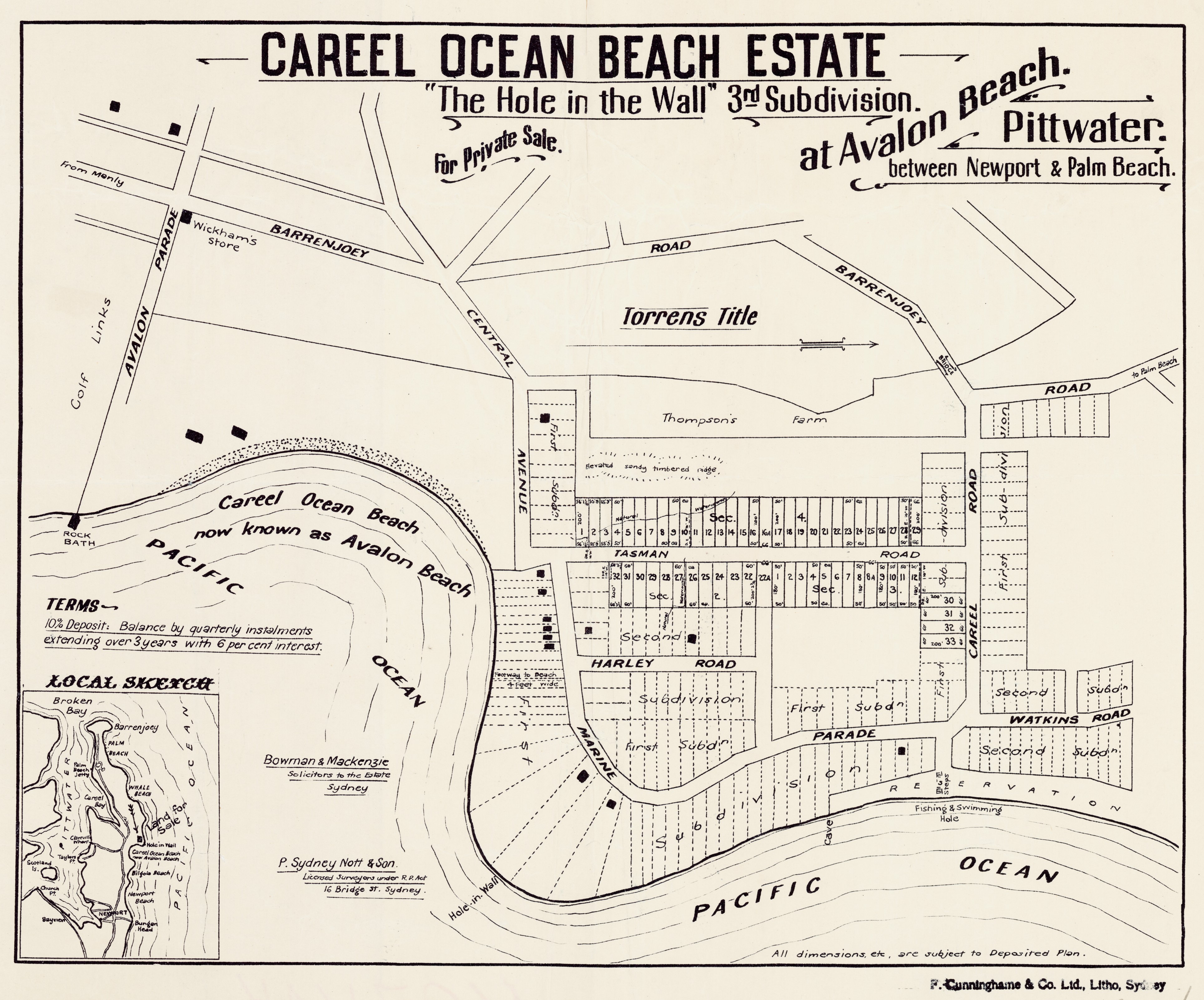They are linked together by the title of Johnston Estates, but are separate, and strung across the Barrenjoey Peninsula, between Avalon and Pittwater. There are 14 allotments in the section situated on the narrow strip which juts Into Pittwater and terminates at Stripe Head. They overlook the broad sheet of water, and are Within 100 feet of it. The second wayside estate has actual water frontages to Careel Bay. There are eight of these, with big depths of nearly 400 feet, which gives them other frontages to Bayview-road and Queen's-avenue as well. The Avalon offering is situated slightly north of the beach, on a rising slope which gives wonderful views across Pittwater, as well as down the southern coastline. This is the bigger section, its 34 allotments having frontages of from 40 to over 100 feet. Deposits for water frontages are £10. per lot, and for others £5 per lot. AVALON-CAREEL (1926, December 24). The Sun (Sydney, NSW : 1910 - 1954), p. 2 (FINAL EXTRA). Retrieved from http://nla.gov.au/nla.news-article224119171