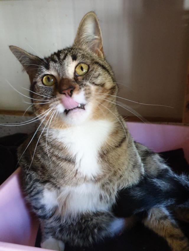 Bruce a 12 month old super smoochy tabby boy found his way into the pound after being hit by a car. He stayed at our clinic for some time in the hope that nerve damage would heal but unfortunately it did not happen. Bruce had his hind leg amputated and he has recovered so well. He really has the hang of hopping around. He spends a lot of time with Cornflake exploring all the nooks and crannies of our cat enclosure. Bruce weighs 3.6kg.