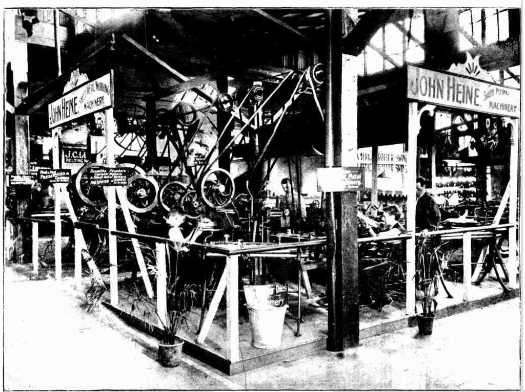 That is an invitation that ought to be availed of. In fact, in connection with this exhibition So many people have expressed wonderment at the excellence of the manufactures exhibited on the various stands, and incredulity that they could be made here, that it might be worth the while of certain manufacturers to consider whether it would not profit them to arrange an occasional visiting day, which could be well advertised, and might lead to a new appreciation of their manufactures. We appear now to be reaching the stage which proved so important in America, when we not only make the goods, but invent and make new processes and machines to make them. Mr. Heine's exhibit is an example in point. It consists chiefly of a collection of sheet metal-working machines, hard at work turning out artistic fancy boxes as souvenirs of the exhibition. This type of machinery is used by plumbers, tinsmiths, and canmakers for turning out canisters, tubs, buckets, metal ceilings, biscuit tins, match and tobacco boxes, etc. The machines are at work each afternoon and evening, and they are so well made as to be easily worked, even with unskilled labour. One of Mr. Heine's latest productions makes 'down pipes' from one and a half inch to six inches diameter, in 6ft or 8ft lengths. Other machines used in the sheet metal trade, such as presses and dies, rollers and folders, side seamers, angle benders and burring machines, are also shown.