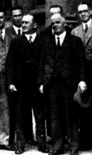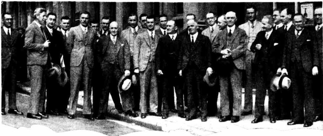 A PARTY OF 23 COUNCILLORS and other members of the Metal Trades Employers' Association, who came from Sydney last flight to attend the meeting of the local branch of the organisation, inspected the Steel Works and other local industries today. The President (Mr. Heine) is standing thirteenth from the left, and on his left is the President of the local branch (Mr. H. B. Horley). The party also included the Vice-president of the Association (Mr. G. E. Griffin) and the following: —