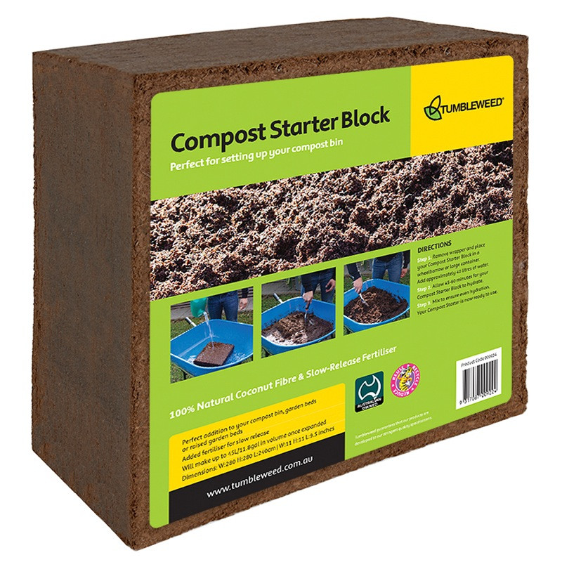 COMPOST STARTER BLOCK: $9.95 - 45L block expands after adding water. Coir fibre with slow release fertiliser for better results. Helps homes with small yards, due to less grass and leaves. Easy carry handle.