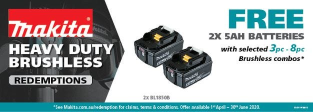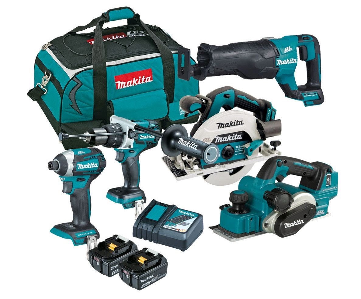 Includes: 18V Brushless Hammer Driver Drill. 18V Brushless Impact Driver. 18V Brushless Planer. 18V 165mm Brushless Circular Saw. 18V Brushless Reciprocating Saw. 18V Fast Charger. 2 x 18V 5.0Ah Battery with Gauge. Carry bag. Bonus via redemption 2 x 5AH Batteries.