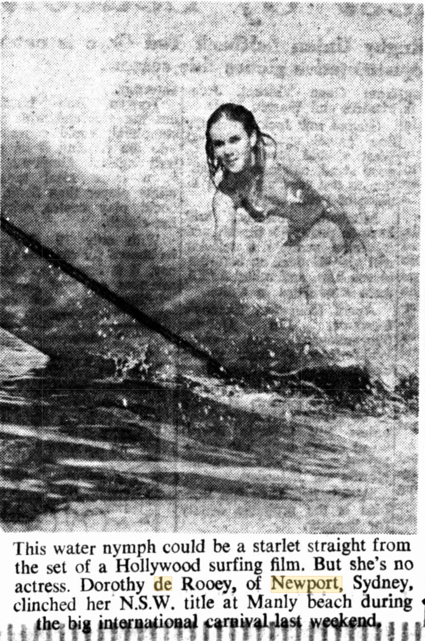 Dorothy De Rooy, (Vidgen) won the NSW open class women’s surfboard riding championship in April 1964 while 16. It was the 3rd year in a row Dorothy had taken out the NSW Championship. 1964 year though was that year – when the World Championships came to Manly and surfing was beginning to take off throughout Australia.