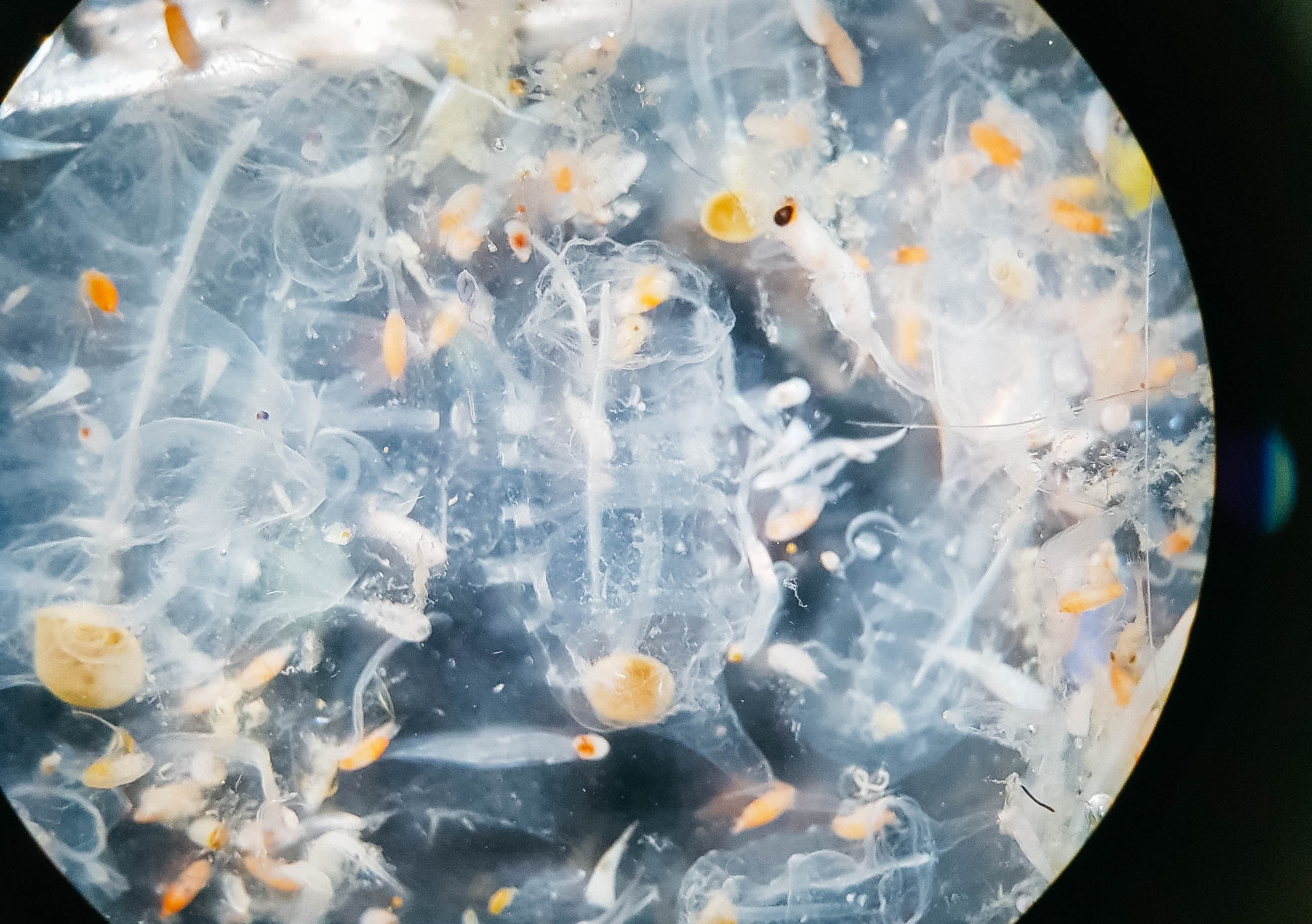 Photomicroscope view of zooplankton, including a salp (Salpa fusiformis). Photo: Kylie Pitt.