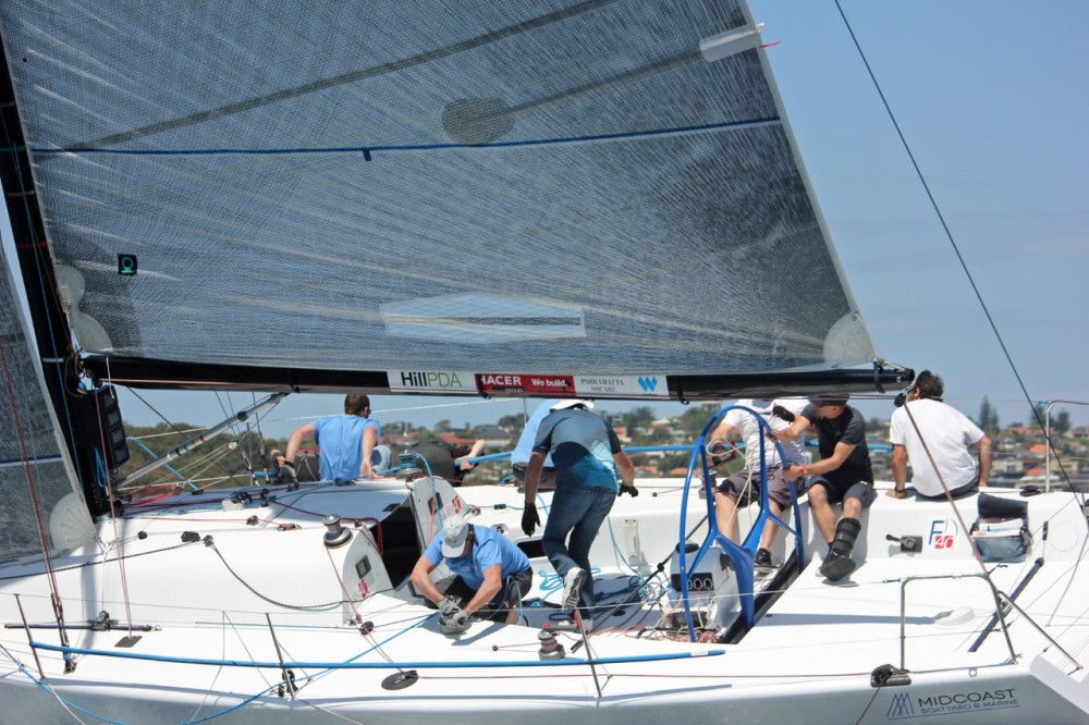 Joe de Kock’s Newcastle Farr 40 Good Form was back out with the fleet, the skipper wearing a moon boot to support his ankle which was injured when he accidentally stepped into the mainsheet which then loaded up in a gybe in strong winds on Saturday. Doctors at Lake Macquarie Private Hospital don’t believe de Kock sustained any broken bones but can’t diagnose him properly until the swelling and bruising settle down.