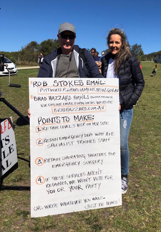 Ms Baker, who lives at Avalon, also encouraged hospital supporters to email Pittwater MP Rob Stokes and Health Minister Brad Hazzard, saying they want Mona Vale Hospital to remain as a Level 3 facility with acute care services.