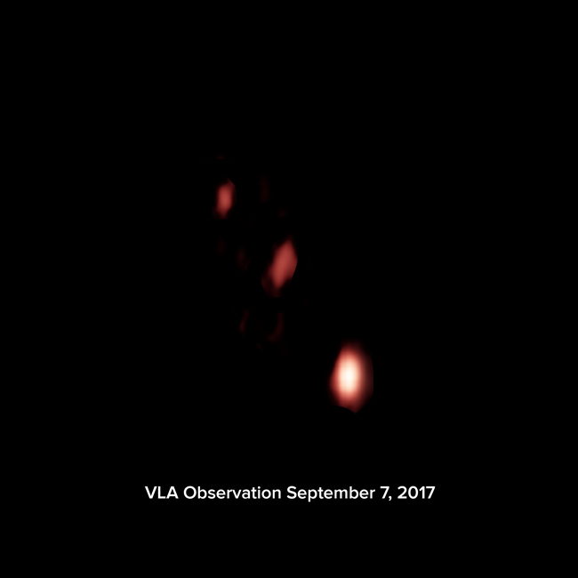 VLA image of the radio emissions coming from the location where two neutron stars collided and generated gravitational waves. The emission from the collision site is the middle object in this image. Credit: NRAO/AUI/NSF; G. Hallinan & A. Corsi et al., K. Mooley et al.