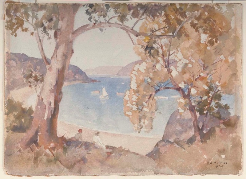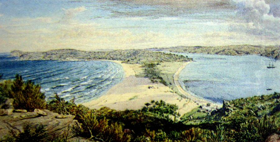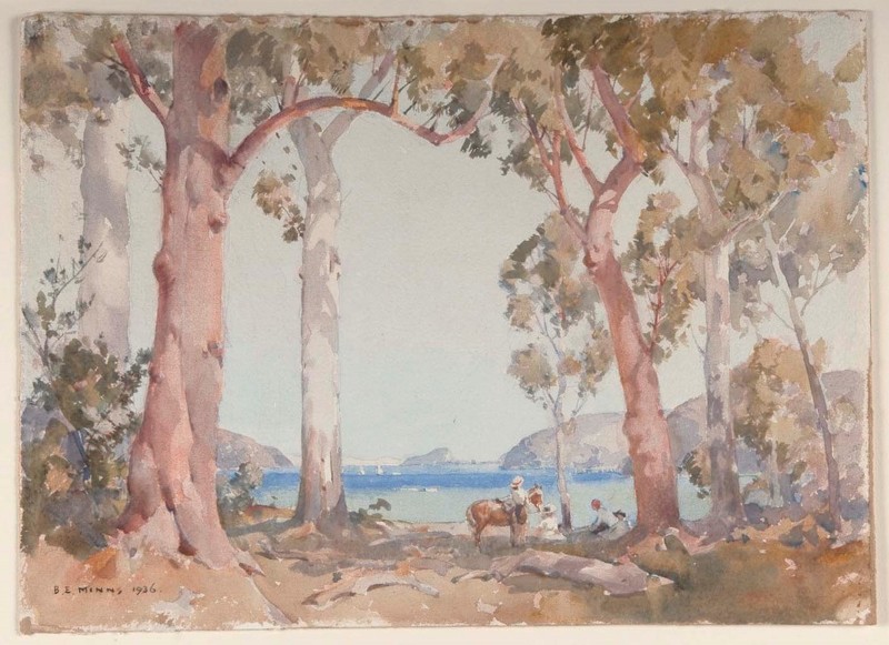 This impressive and historical picture is reproduced from a painting by the well-known artist B. E. Minns, and illustrates an incident of Governor Phillip's second overland journey from Manly towards Pittwater in 1789. Phillip and his principal officers are shown on what is now known as Beacon Hill. The party is looking back towards Manly (in right-centre distance) and the Heads (on the extreme right) This is a copy of the original of the painting, which is about 36 inches by 24 inches, is in the possession of the artist. In the reproduction a slight liberty has been taken — the original has more sky. ANNIVERSARY DAY, 1788-1935 (1935, January 23). Sydney Mail (NSW : 1912 - 1938), p. 26. Retrieved from http://nla.gov.au/nla.news-article166110726