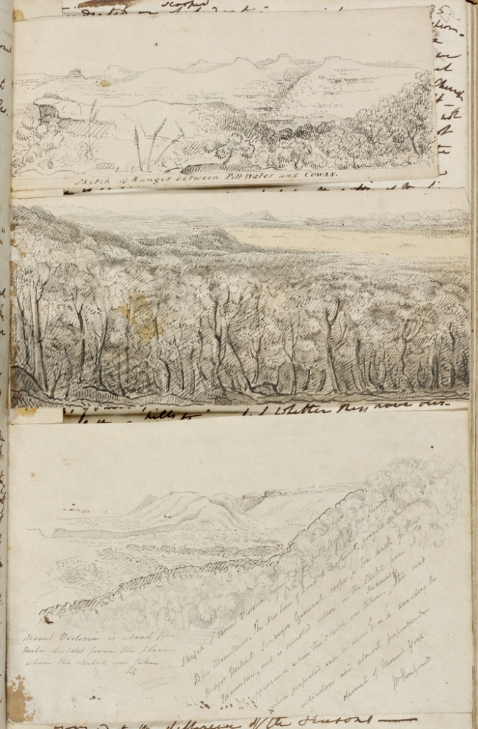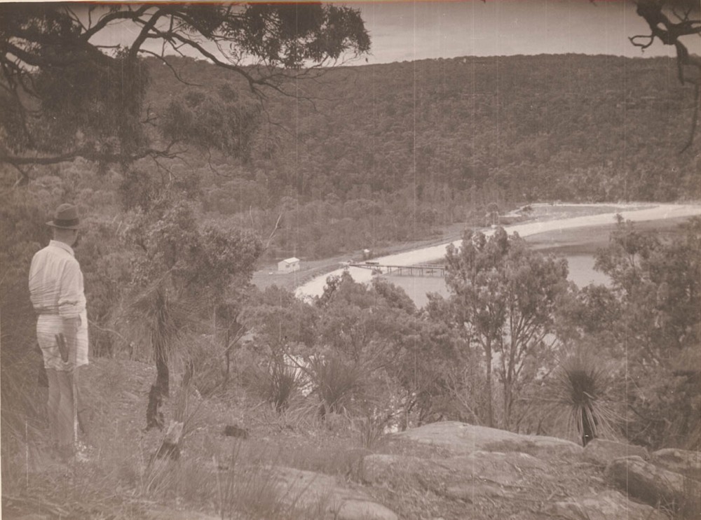 "Seven and a half miles from North Harbour, - Jenkins' house; the road for the last mile along a level sandy beach. On the left is Narabeen lagoon. Mr. Jenkins has a snug house here, and much land in cultivation, which is an agreeable prospect from the sea. Eleven and a half miles from North Harbour -Hut on the sea shore. The path from the Pennant Hills Road reaches the sea, and joins this coast road at the farm of one Foley - a tenant of. Mr. Wentworth's; the distance from thence being twelve miles. About half a mile further on is the south-east arm of Pitt Water, on which there are some small cultivated farms. The head of Pitt Water as seen from the heights along which the road or path leads, is equal to any lake scenery, and there are many romantic spots, with good land, on its banks, which might be converted into good farms. Thirteen miles from North Harbour - Several farms and cottages. Fourteen miles- The Rev. Mr. Therry has a grant here. Fourteen and three-quarter miles - The Hole-in-the-Wall, being a rocky projection forming a rude archway with the shore."