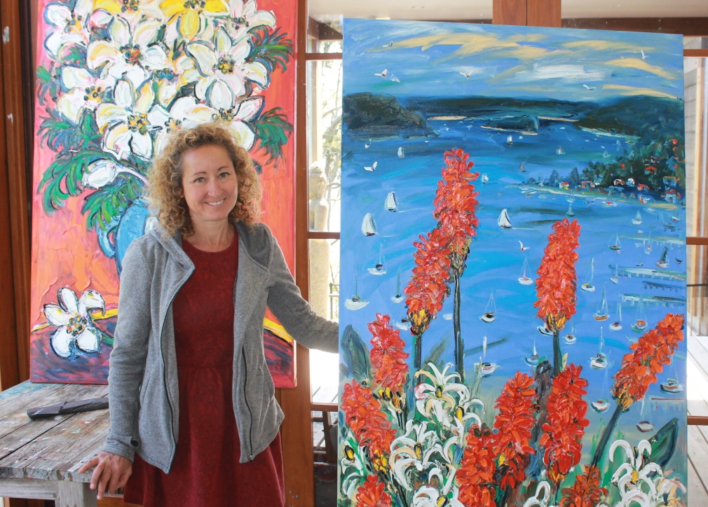 Nada with recent work - Red hot pokers Over Pittwater.