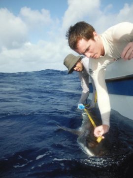 To monitor the movement of the sharks, the researchers used both conventional numbered tags and satellite-enabled tags. The first method is cheap and can cover large numbers of sharks -- they tagged 262 this way -- but relies on the return of tags to the researchers by fishers who catch the sharks, which is a rare occurrence. The second method allows the researchers to track the sharks' movement by satellite, but each tag is very expensive. They attached satellite tags to 11 sharks.