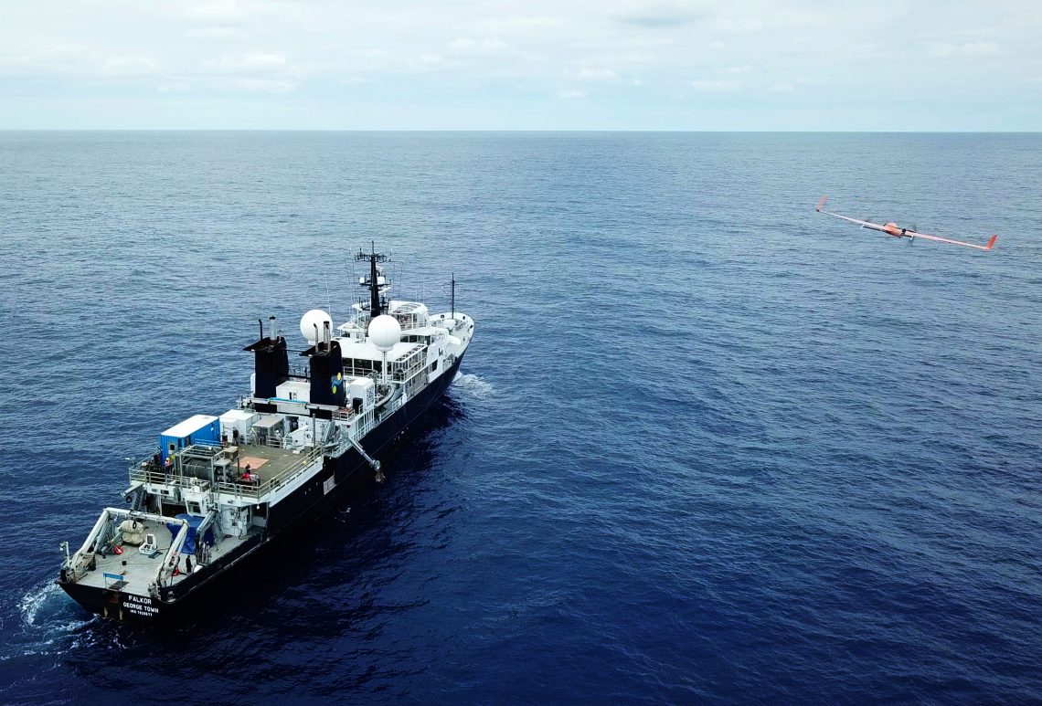 A Flightwave Edge UAV, piloted by Trent Lukaczyk, flies towards R/V Falkor. The Unmanned Aerial Vehicle worked in concert with underwater robotics and the crew onboard the ship gathering data. Credit: Schmidt Ocean Institute