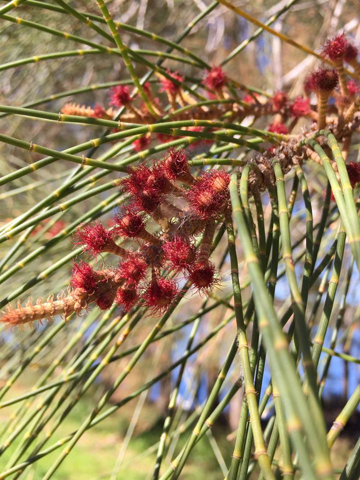 Swamp Oak, Casuarina glauca, trees are either male or female. Noticed a few brown ones just now? It's not drought, but the millions of rusty flowers of the male trees. Some of the billions of wind-blown pollen grains land on the hairy red tiny female flowers, which later develop woody capsules containing winged seeds.These are in Bilarong Reserve.