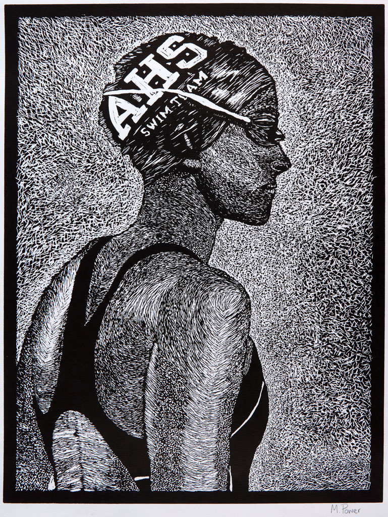 Artist's Statement: Everyone knows the idiom ‘two sides of the same coin’. These words are the inspiration behind my portrait of a person who is special to me and integral to my life. My portrait illustrates a person who is confined to an aqueous surrounding of silence. All emotions are narrowed down to one thin black line, consumed by the result of hours of relentless training, torn, stretched, beaten muscles, early mornings and the pure desire to win. This is someone who only emerges a mere second before the starting gun. This is me.