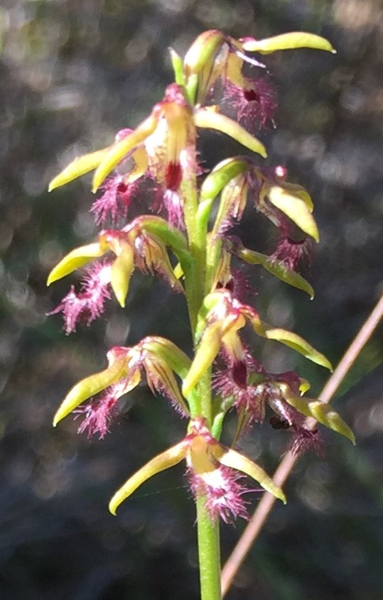 Bauer's Midge Orchid, Corunastylis fimbriata, flowering in March in Coastal Upland Swamp off Waratah Rd Ingleside. This terrestrial orchid is only pollinated by a Chloropid fly, an example of the intimate relationships between orchids and their insect pollinators. Image: Wendy Grimm.