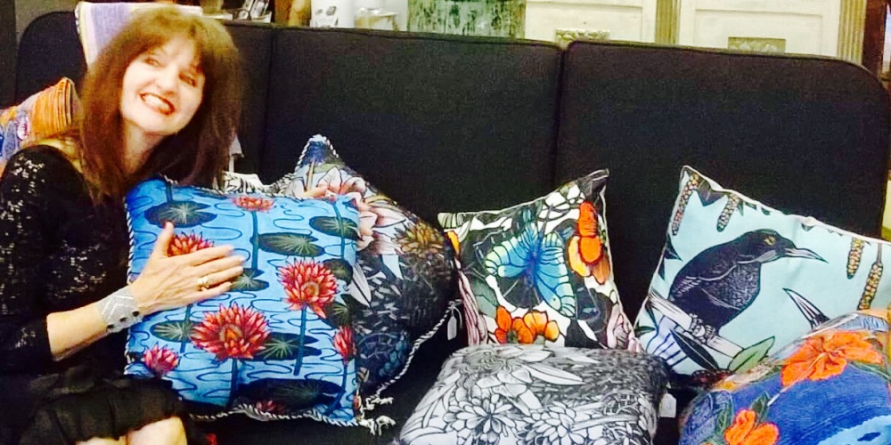 Jude with a range of her cushions with Linocut designs Ranging from $89-$170