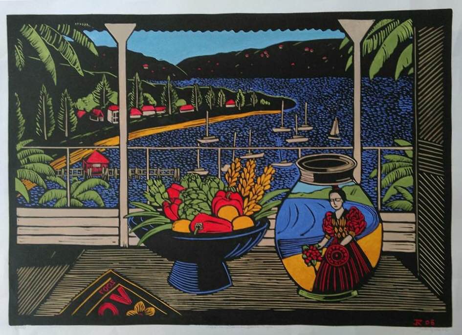 She loves the tactile and dramatic quality of linocuts, and the vivid colours and textures of the Pacific, Asia, South America and Australia. Her main goal is to take the viewer on a visual journey of symbols and forms, a trip into another world.