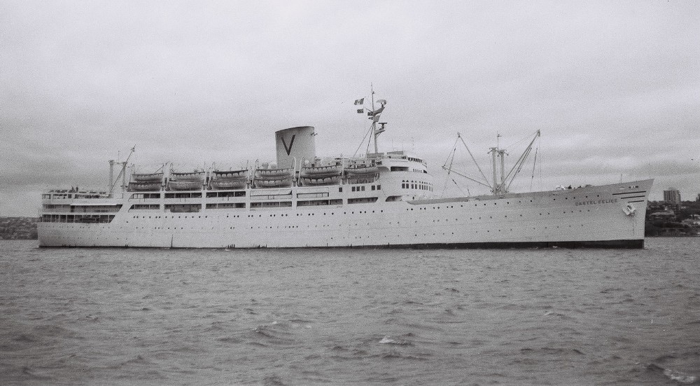 The Castel Felice ventured to Australia as an immigrant ship on a total of 101 voyages between 1952 and 1970, carrying over 100,000 immigrants to Australia and New Zealand. She was commanded by an Italian crew and carried passengers from many different countries including Italy, Germany and Britain. Many passengers remember the rough seas and shabby state of the aged ship with apprehension and delight.