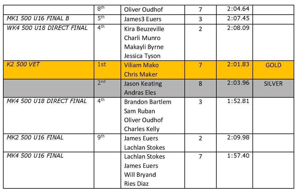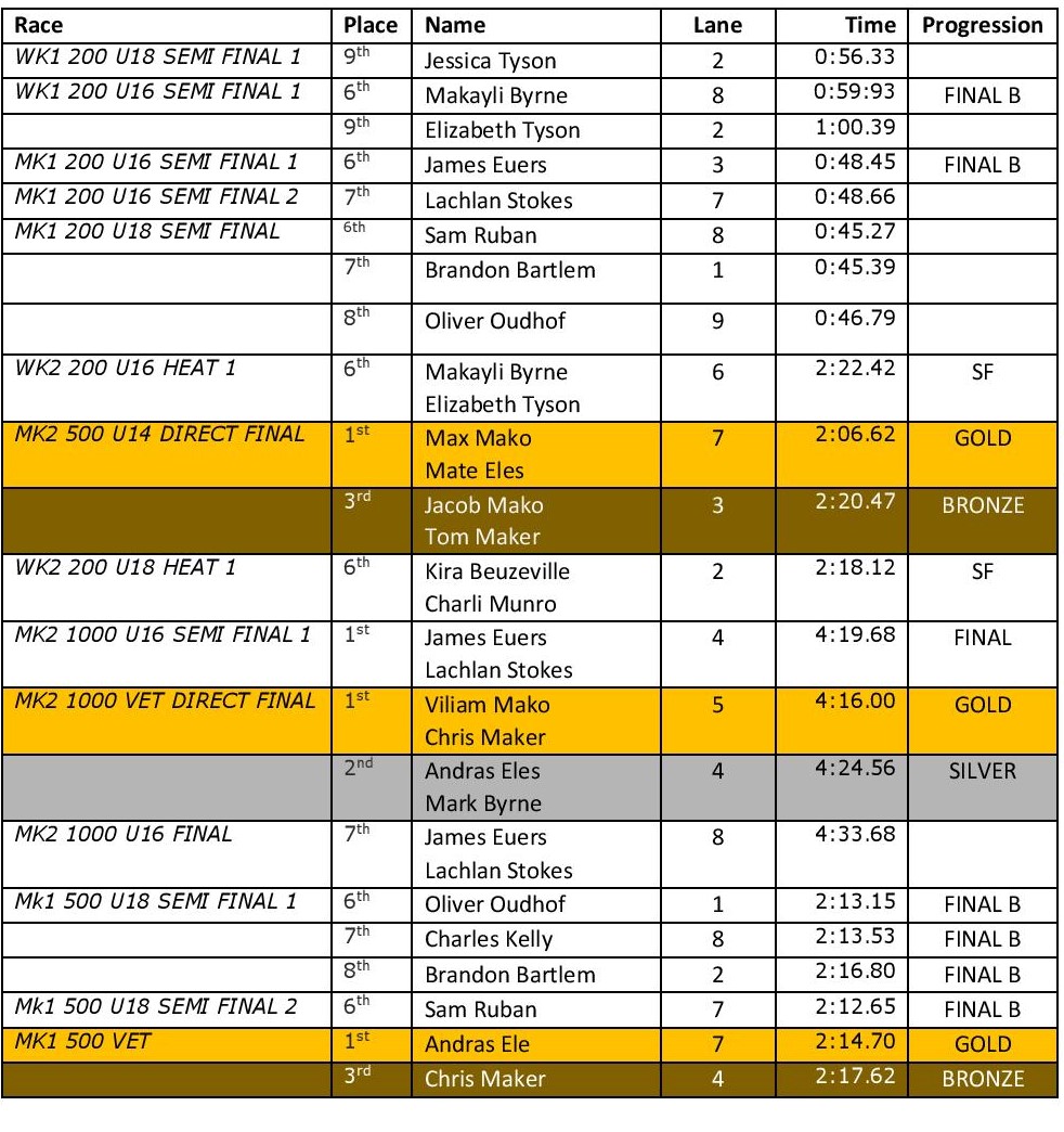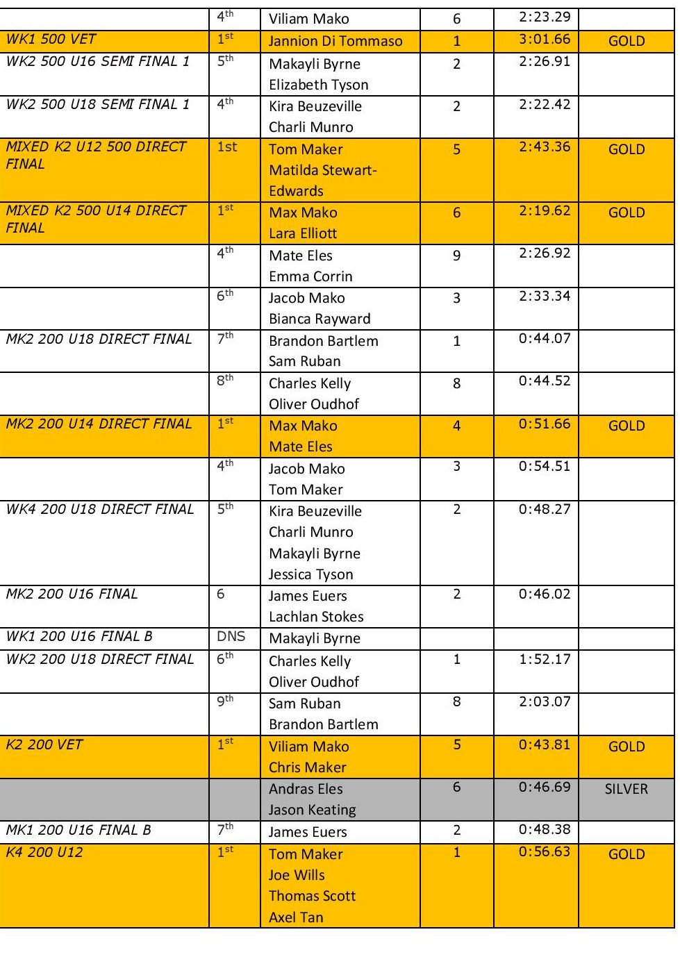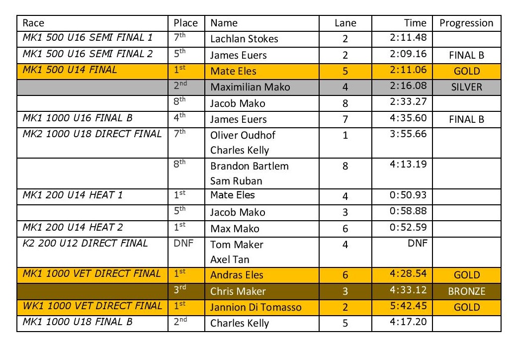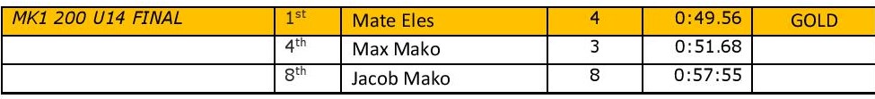 - 2 Gold for Mate Eles Under 14 K1 500 & 1000. Silver & Bronze for Max Mako.