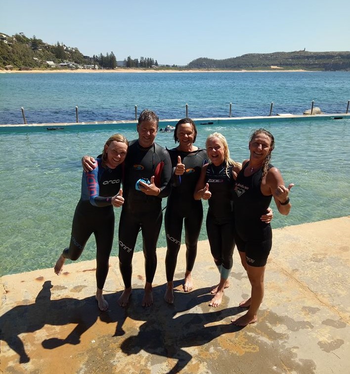 Margie and fellow Barrenjoey Breaker swimmers just after completing a to Barrenjoey and back 5.8 k swim, October 24 2017
