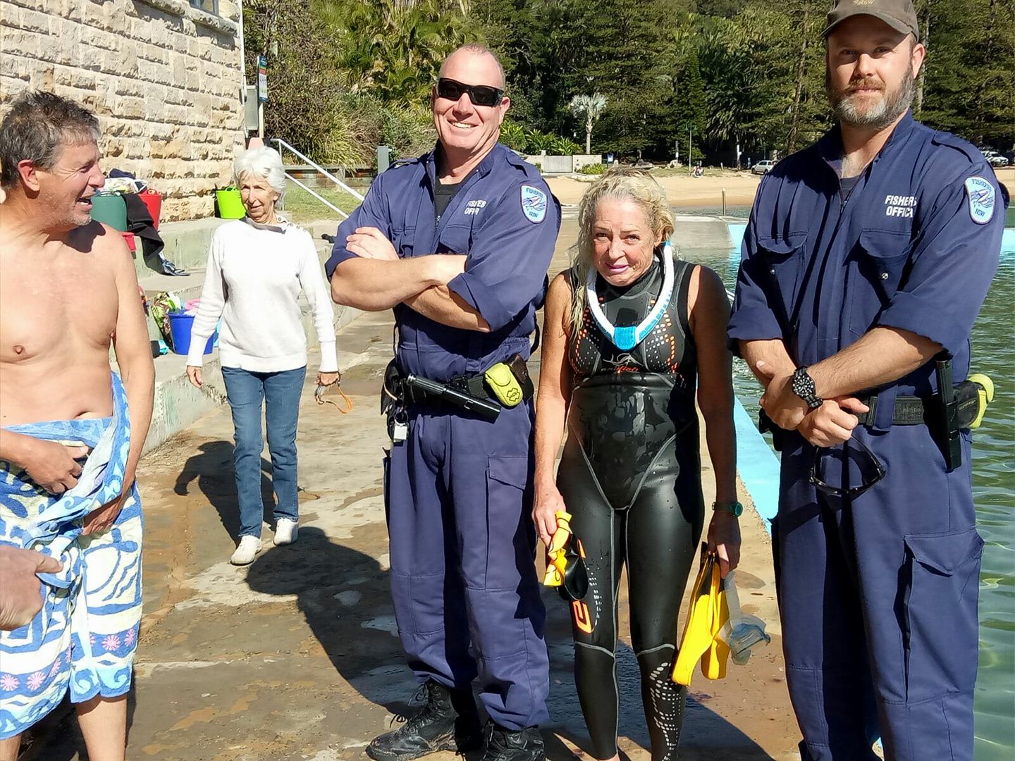 Mucking about with NSW Fisheries Officers, August 2017 - Margie had warned them off spearing 'her blue groper' earlier, and then they emerged from the sea and donned their uniforms!