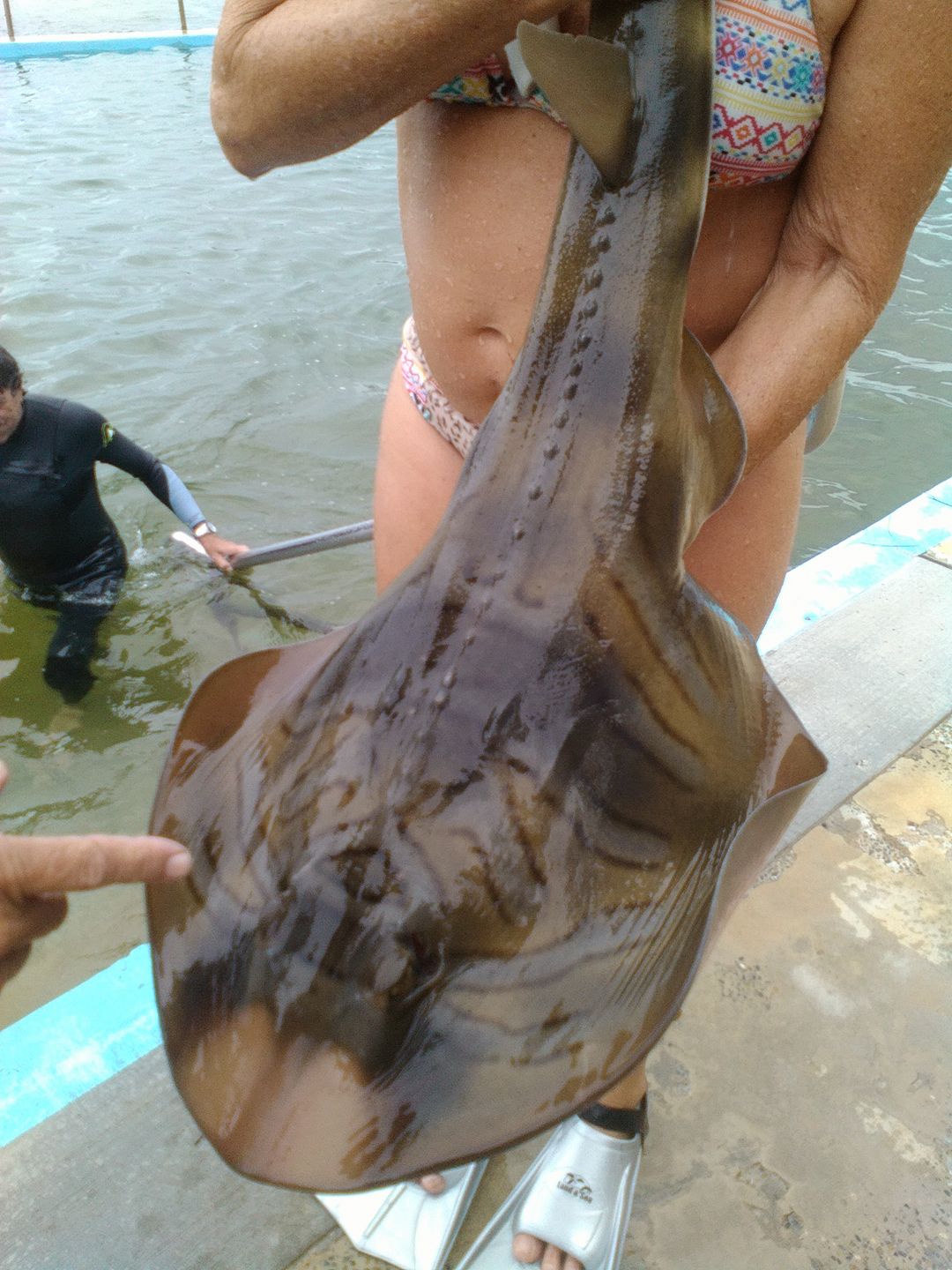 Well, they’re not really sharks, they’re rays; the shovel-nosed ray or the banjo ray – although a lot of people call them ‘shovel-nosed sharks’ or ‘banjo shark’, probably because their tail and fin looks like a shark, but they are completely harmless. What’s happening there is the fishermen who go out on the rocks to fish past the pool are throwing them in there because if they throw them back into the ocean after catching them they will probably take their bait again. So they throw them in the pool.
