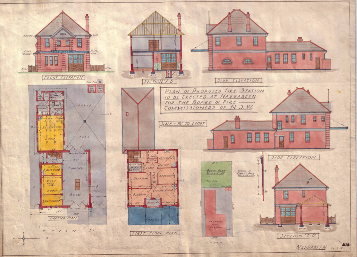 Historical insights into the formation of the Narrabeen Fire Brigade and other fires and Brigades in our area, show the frequency of fires in a rural-holiday landscape predominated by structures built from timber. This first 'crew' was a volunteer Fire Brigade, staffed by six men including the Captain. [1] The Brigade was initially a part of the Narrabeen Fire District, but on November 1st 1923 it was incorporated into the Sydney Fire District. That first Station was situated in a “Sexton Simplex building" on the corner of Ocean and Devitt Street, Narrabeen.