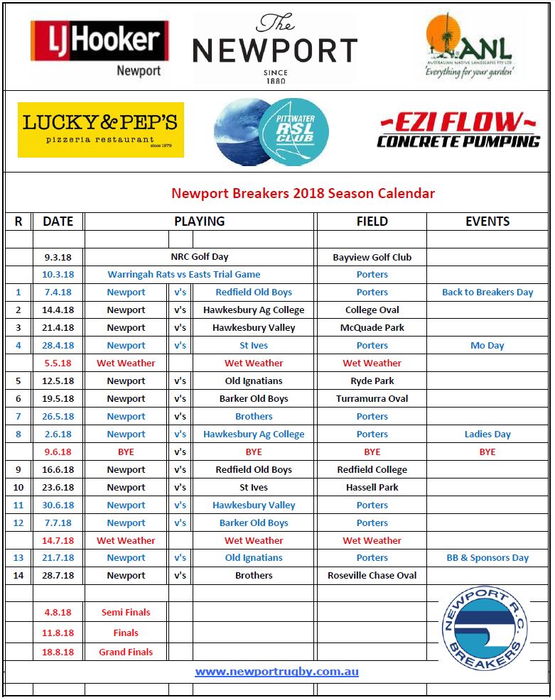 Our 2018 Calendar - come along and cheer on the Breakers!
