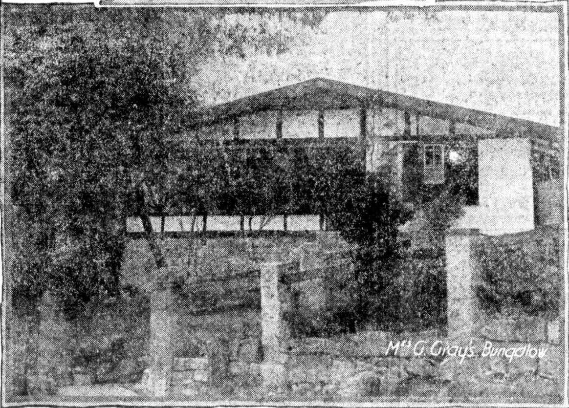 The A. J. Horderns own the long, low-lying villa at the end of the beach, which was lent to the de Chairs and their family for a summer holiday. This place boasts its own electric light plant and to add to his gentlemen guests' comfort, the host even has the rooms stocked with extra in outfits. Well-known is the old-established wild garden, featuring tropical plants which surrounds the home of the R. T. McKays, and that of the young Graham Prattens, which is secluded among groups of gum trees.