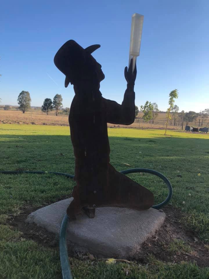 This says it all a farmer on his knees praying for rain holding a rain gauge. But ironic on the green lawn. It’s watered by bore water.