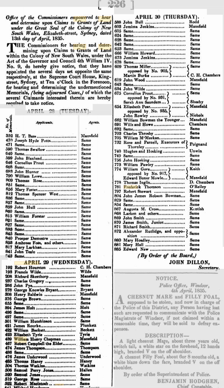 Government Gazette Notices (1835, April 22). New South Wales Government Gazette (Sydney, NSW : 1832 - 1900), p. 226. Retrieved from http://nla.gov.au/nla.news-article230655181