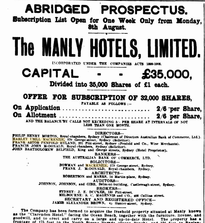 What they were doing in the lead into the tram opening - and providing an alternative to the long and winding tracks of the coaches, shows a propensity towards developing or improving, for profit. Harley Usill Mackenzie, from which we today have North Avalon's 'Harley Road', was involved in the redevelopment of the Clarendon Hotel on Manly Beach in 1910 into the Manly Pacific so many know today.