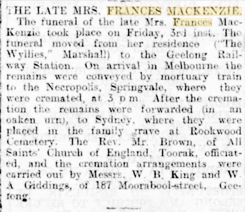 IN THE SUPREME COURT OF NEW SOUTH WALES-Probate Jurisdiction-No 73414-In the Will of HARLEY USILL MACKENZIE late of Sydney In the State of New South Wales Solicitor deceased -Notice is hereby given that the Accounts In the above Estate have this day been filed in my office Supreme Court Building King street, Sydney and all persons having ans claim on the said Estate or being otherwise interested therein are hereby required to come In before me at my said office on or before Monday the 12th day of August next at 11 o clock in the forenoon and inspect the same and If they shall think fit object theieto otherwise if the said Accounts be not objected to the same will be examined by me and passed according to law And notice is also hereby given that on the allowance of the sold Accounts by the Court commission will be applied for on behalf of the Executors Dated this seventeenth day of July in the year one thousand nine bundled and twenty nine L M ADDISON (L S ) Registrar) BOWMAN and MACKENZIE Proctors for the Executors, 14 Bond street Sydney. Advertising (1929, July 18). The Sydney Morning Herald (NSW : 1842 - 1954), p. 2. Retrieved from http://nla.gov.au/nla.news-article16558895