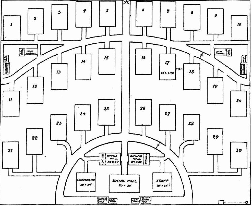 PLAN OF THE ENCAMPMENT AT NARRABEEN, COMPRISING COTTAGES FOR 30 FAMILIES, AND ACCOMMODATION FOR COMPTROLLER AND ATTENDANTS. THIS CAMP WILL BE LOCATED NEAR NARRABEEN, ON A PIECE OF GROUND THREE ACRES IN EXTENT, CLOSE TO "THE BASIN."