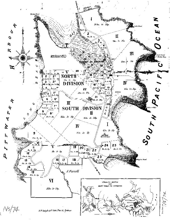 NORTH DIVISION. FIVE CHOICE FARMS. No. I., area 104a. Ir. 22p. II., ditto 76a. 2r. 30p. III., ditto 128a. lV. 34p. IV., ditto 6oa. Or. 32p. Each of these have frontages to the Pacific Ocean and the main road to Barrenjoey. On Lot III. is the Homestead and Residence now in the occupation JOHN COLLINS, Esq., and also the Celebrated Cave. No. V., area 61a, 3 v. 32p., has frontage to the Central Road which passes from the coast-line to Pittwater, crossing the main road at the' Recreation Reserve.