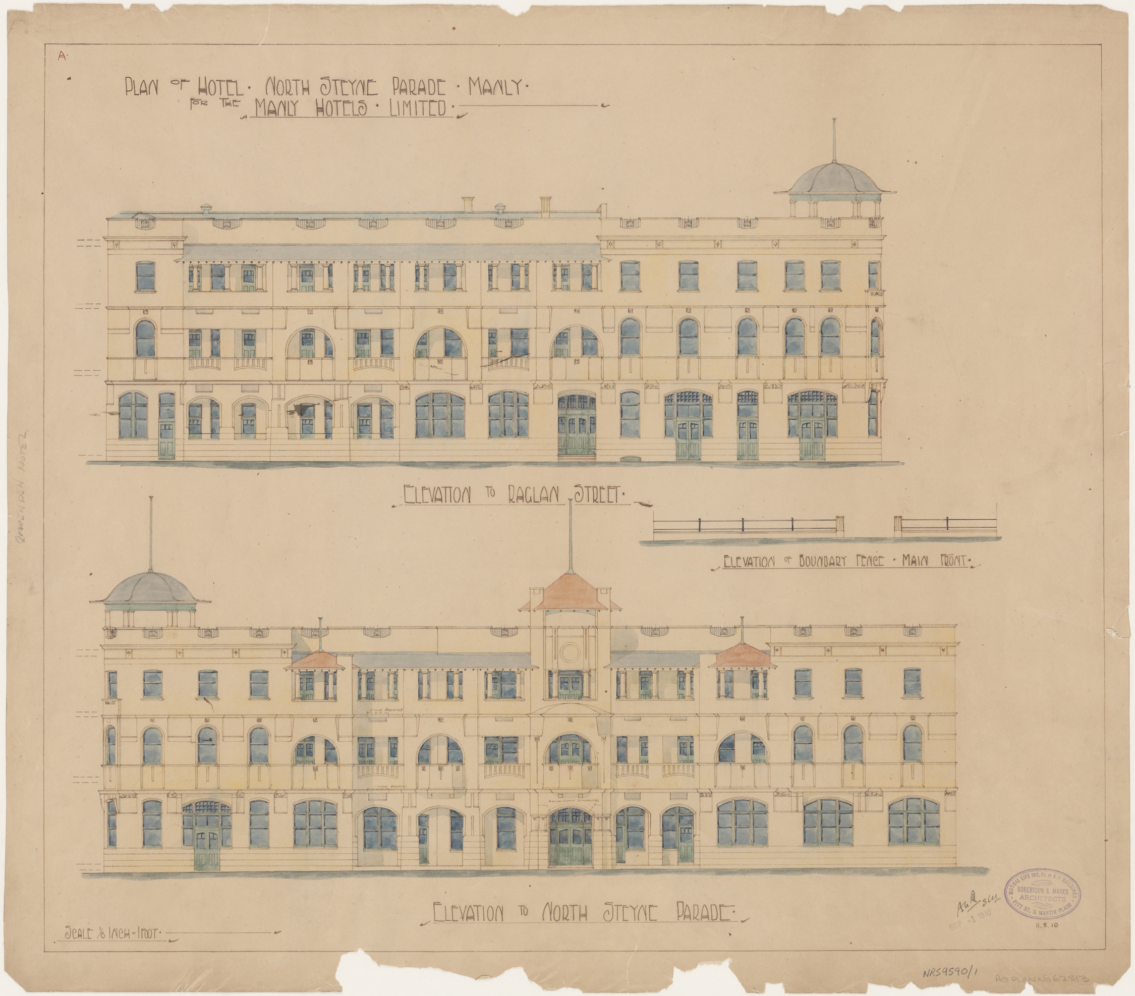 Also available in NSW State Archives and records: Hotel, Raglan Street and North Steyne Parade, Manly, Plan of hotel, ground floor plan, Applicant/owner, Manly Hotels Limited, Architect Robertson and Marks, Pitt Street and Martin Place, Sydney + Hotel, Raglan Street and North Steyne Parade, Manly, Plan of hotel, ground floor plan, Applicant/owner, Manly Hotels Limited, Architect Robertson and Marks, Pitt Street and Martin Place, Sydney + Hotel, Raglan Street and North Steyne Parade, Manly, Proposed first floor and mezzanine plan, Applicant/owner, Manly Hotels Limited, Architect Robertson and Marks, Pitt Street and Martin Place, Sydney, Signed 1 September 1910 + Hotel, Raglan Street and North Steyne Parade, Manly, Proposed first floor and mezzanine plan, Applicant/owner, Manly Hotels Limited, Architect Robertson and Marks, Pitt Street and Martin Place, Sydney, Signed 1 September 1910 + Hotel, Raglan Street and North Steyne Parade, Manly, Proposed first floor plan, mezzanine floor plan, Applicant/owner, Manly Hotels Limited, Architect Robertson and Marks, Pitt Street and Martin Place, Sydney, Signed 27 July 1911, Clarendon Hotel written on back of plan + Hotel, Raglan Street and North Steyne Parade, Manly, Proposed first floor plan, mezzanine floor plan, Applicant/owner, Manly Hotels Limited, Architect Robertson and Marks, Pitt Street and Martin Place, Sydney, Signed 27 July 1911, Clarendon Hotel written on back of plan + Hotel, Raglan Street and North Steyne Parade, Manly, Proposed ground floor plan and cellar plan, section through rolling way, Applicant/owner, Manly Hotels Limited, Architect Robertson and Marks, Pitt Street and Martin Place, Sydney, Signed 1 September 1910, Clarenden Hotel written at side of plan + Hotel, Raglan Street and North Steyne Parade, Manly, Proposed ground floor plan and cellar plan, section through rolling way, Applicant/owner, Manly Hotels Limited, Architect Robertson and Marks, Pitt Street and Martin Place, Sydney, Signed 1 September 1910, Clarenden Hotel written at side of plan + Hotel, Raglan Street and North Steyne Parade, Manly, Proposed ground floor plan including yard, Applicant/owner, Manly Hotels Limited, Architect Robertson and Marks, Pitt Street and Martin Place, Sydney, Signed 27 July 1911 + Hotel, Raglan Street and North Steyne Parade, Manly, Proposed ground floor plan including yard, Applicant/owner, Manly Hotels Limited, Architect Robertson and Marks, Pitt Street and Martin Place, Sydney, Signed 27 July 1911