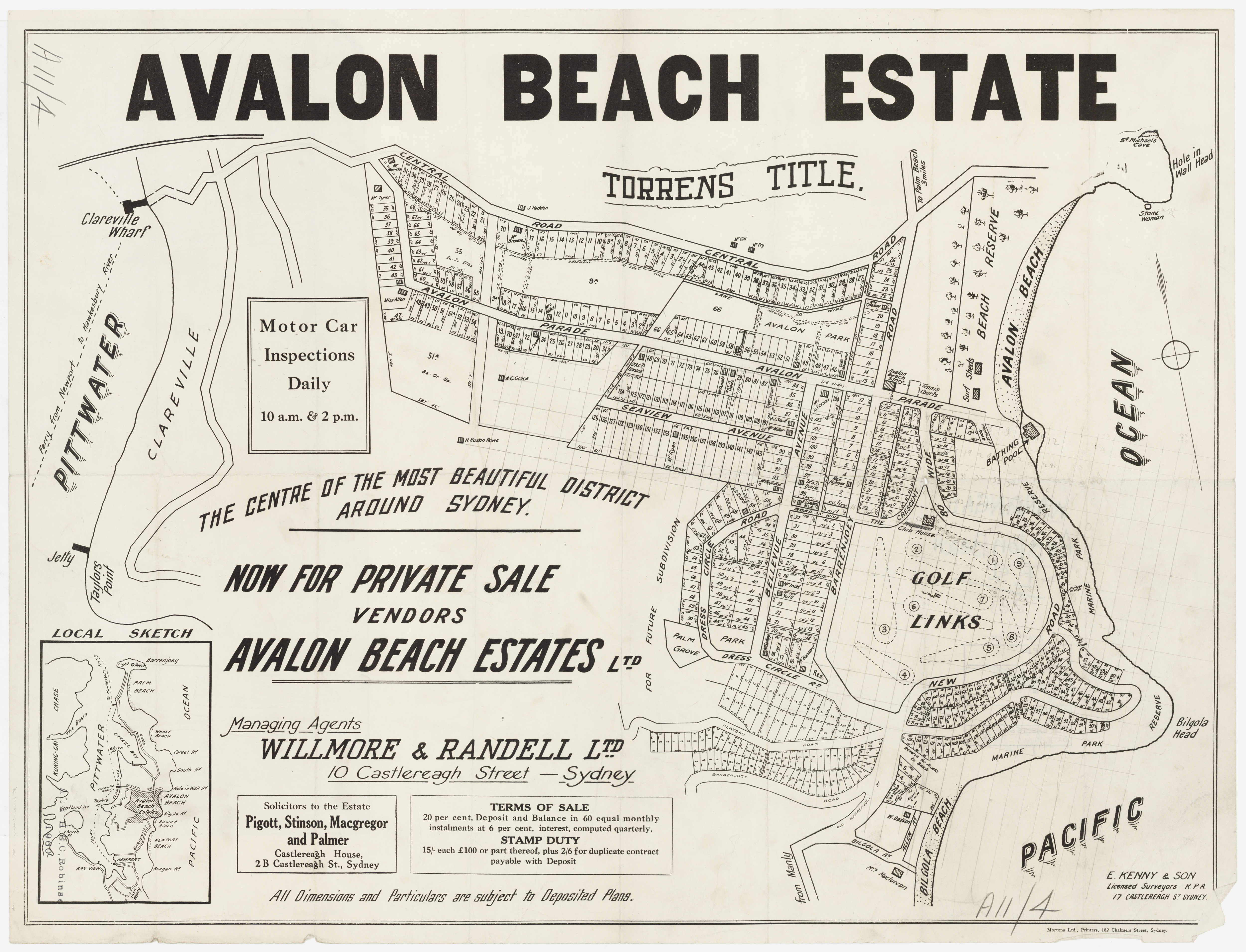 Most of the subdivisions of paddock to smaller blocks in what we today call Avalon began soon after the tram reached Collaroy with hundreds of acres moved under the Real Property Act from 1912 on, and more so in 1913, when the line had been established right to Narrabeen's waters, opening for service to the lagoon on December 8th, 1913 - a Monday. The same shifting of paddocks under the Real Property Act occurred further south - at Warriewood, Narrabeen, Mona Vale and Newport.