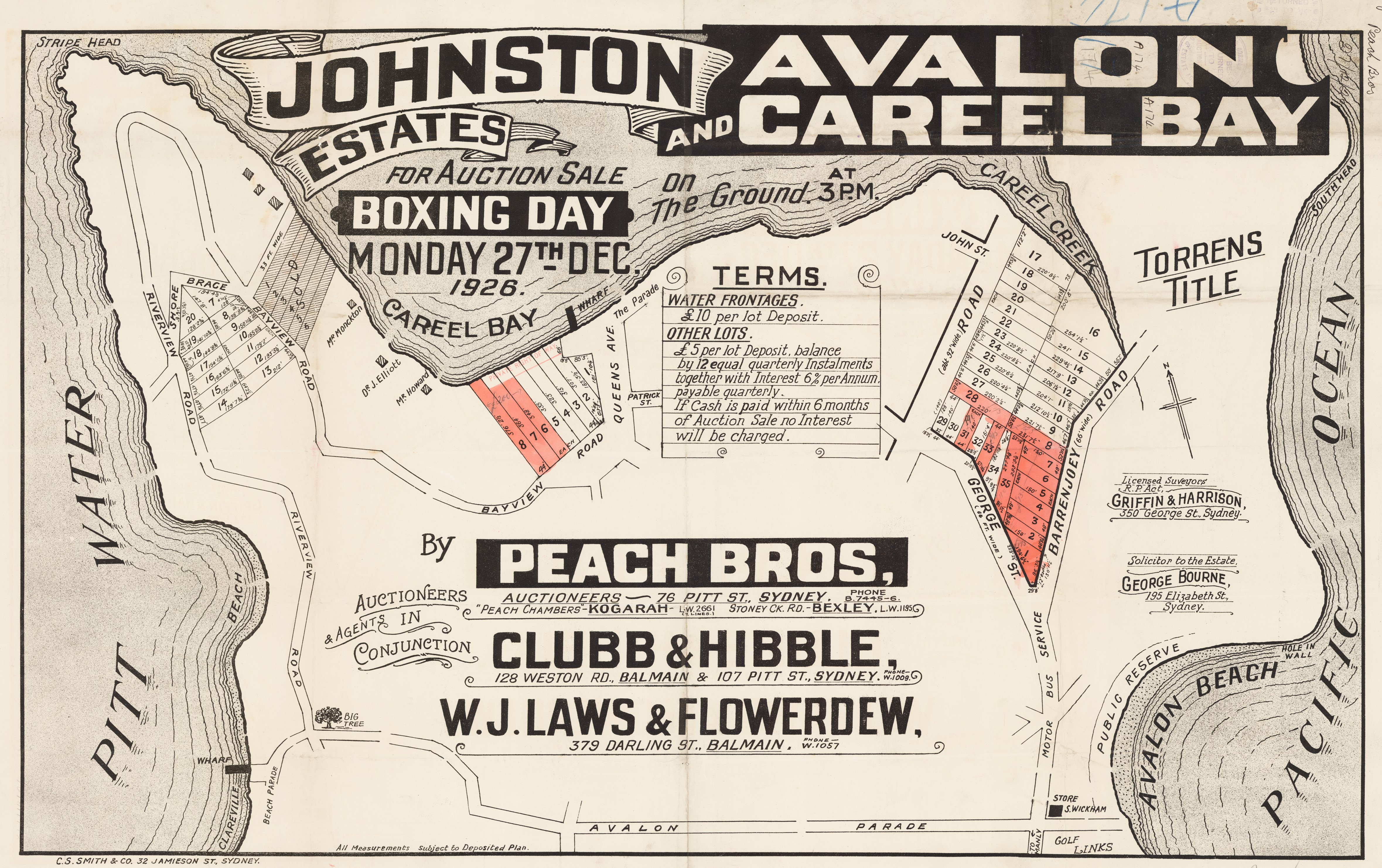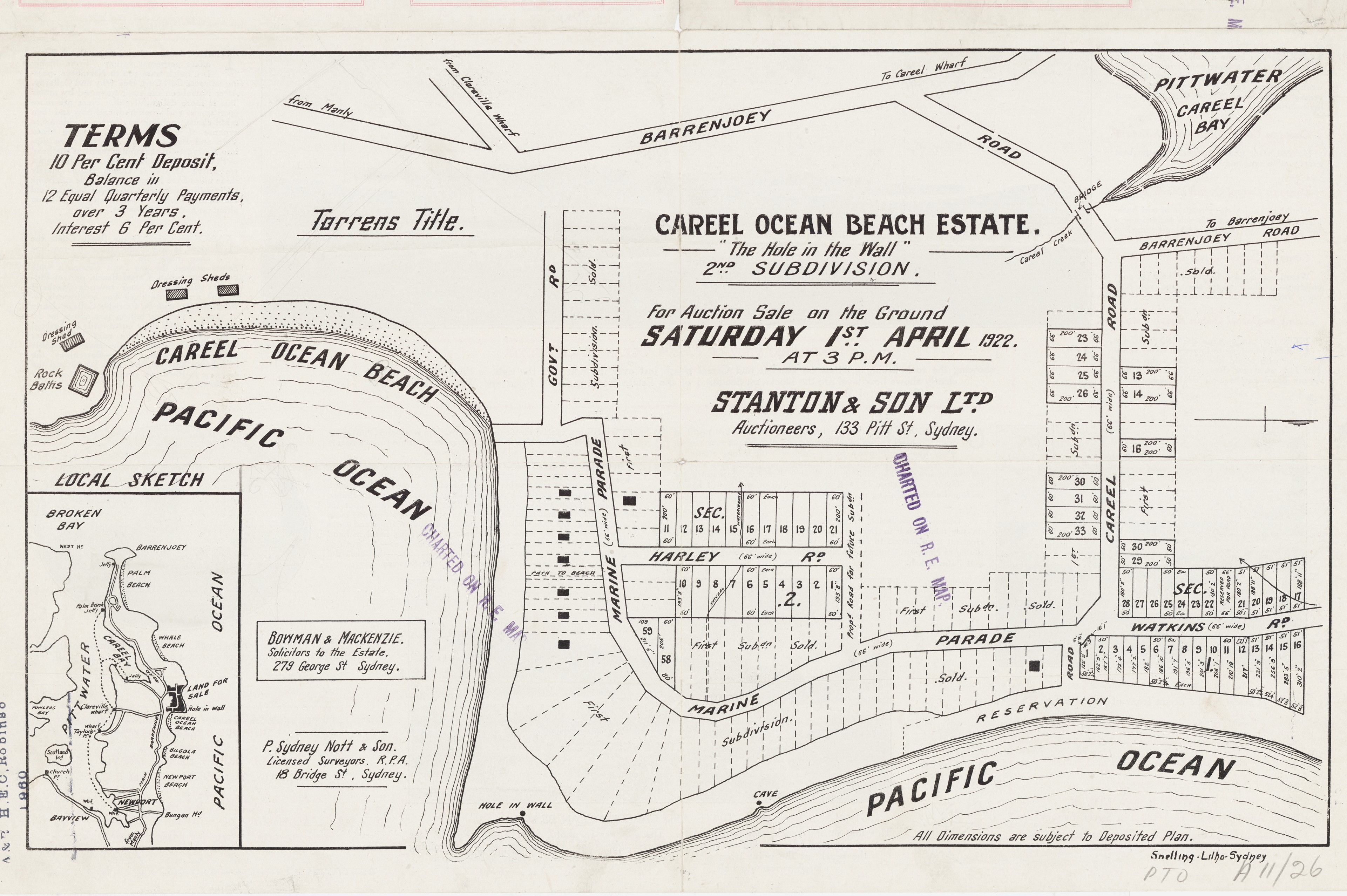 SURVEYOR'S DESCRIPTION. The land forms the pick of the late Rev. Therry's PITTWATER ESTATE, on CAREEL BAY. It is with regard to beauty of scenery, salubrity of climate, and fertility of soil, unsurpassed in this charming locality, and overlooks the tranquil waters of CAREEL BAY and PITTWATER HARBOUR, backed by the bold MOUNTAINS of the WORLD-FAMED HAWKKESBURY on the WEST ; and commands an immense and extensive view over the PACIFIC OCEAN on the EAST. Lots A and B. of block 1, rise in gentle terraces from the MAINROAD to BARRENJOEE, to a height of above 200 feet, and then slope down to the coast in a northerly direction. Lots C and D of Block 1 lie on gently rising ground, partly cleared, and are protected against southerly winds by a wall of high COAST CLIFFS. All these four lots contain an abundant supply of USEFUL TIMBER and practicable facilities for a PERMANENT SUPPLY OF FRESH WATER, particularly lots C and D. which are traversed by a watercourse running into CAREEL BAY.