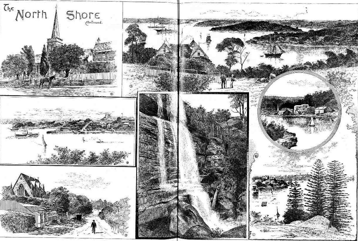 1. VIEW OF LAVENDER DAY 2. NORTH SHORE HOSPITAL, 3. IN ST. LEONARDS PARK. 4. POST OFFICE AND COURT HOUSE. 5. THE WESLEYAN CHURCH. 6, A WATERFALL NEAR ALFRED ST, ST. LEONARDS. 7. THE CONGREGATIONAL CHURCH. 8. HANGING ROCK, NEUTRAL BAY. 9. TOWN HALL AND FIRE STATION 10. MESSRS. G. T. CLARKE &. MCINTYRE'S PREMISES.