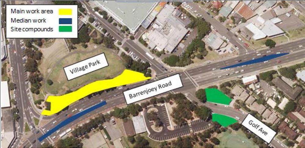The trees that hold together the berms separating Mona Vale Village Park from the main road are still standing at present - but may disappear by week's end. On Monday, March 20th site establishment works began, including fencing off the trees and berms in the Village Park. A 'B-Line Project Update - Mona Vale - Start of work' document dated March 13 shows the work locations:
