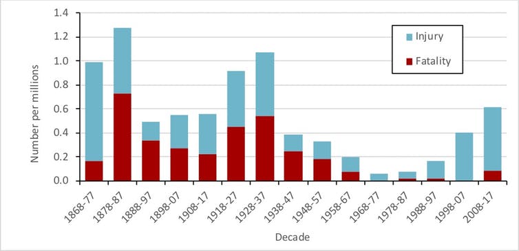 Shark bite incidents in NSW per million people per decade, including fatalities and injuries. Authors
